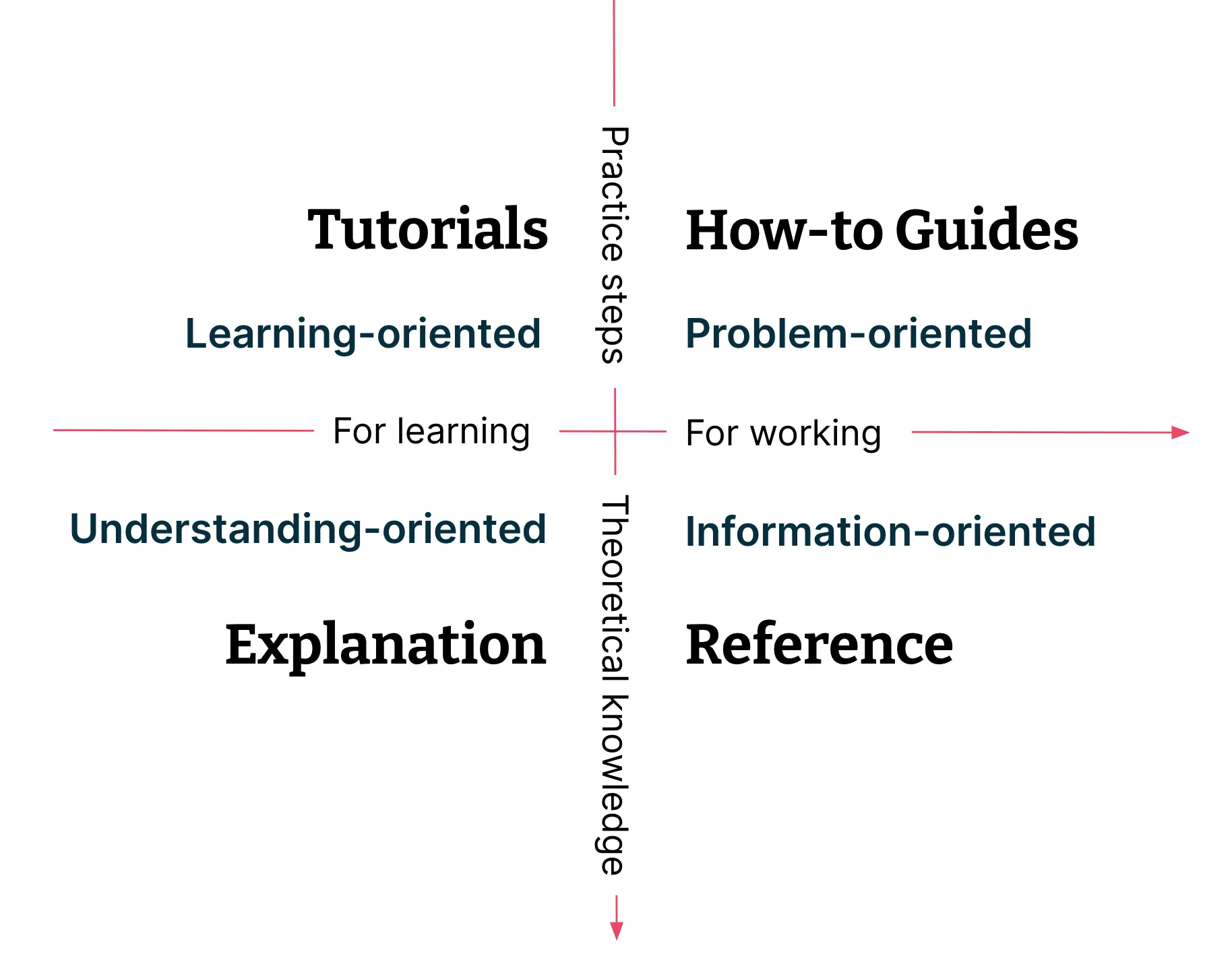 在一个坐标系下,划分象限的两条轴描述了文档所具有的属性,横轴描述文档的使用场景是偏于工作的还是偏于学习的,纵轴描述文档是偏于理论的还是偏于实践的。这四个象限分别是tutorials,how-to guides,reference和explanation: